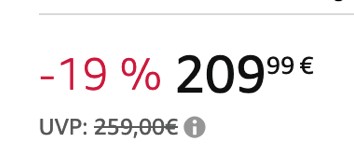 Bewerbung eines WLAN-Repeaters unter Angabe einer prozentualen Ermäßigung (-19%) und eines gestrichenen Preises („UVP: 259,00 €“)