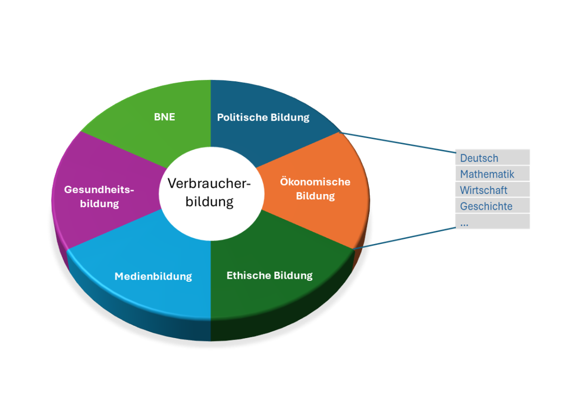 Beispielsweise besitzen für den Teil der Verbraucherbildung, der Schnittstellen zur ökonomischen Bildung besitzt, die Kompetenzen zentrale Bedeutung, die etwa mit den Schulfächern Wirtschaft, Geschichte, Mathematik und Deutsch vermittelt werden.
